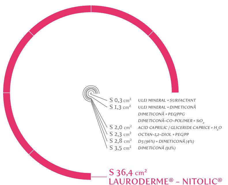 Testes efetuados à fórmula de LAURODERME® - NITOLIC® compararam a eficácia com alguns produtos líderes no mercado da UE. Testes de dispersão de uma gota de 5 µl de volume, em 30 minutos.