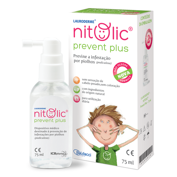 LAURODERME®- NITOLIC® Prevent Plus é um dispositivo médico que impede a colonização dos piolhos e a deposição das lêndeas, reduzindo o risco de infestação ou reinfestação. A sua fórmula especial é baseada em ingredientes de origem natural e permite criar uma película protetora na superfície capilar o que impede a colonização do parasita e a deposição de ovos (lêndeas).