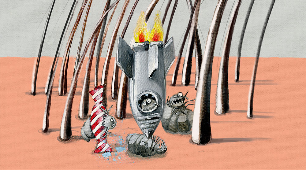 Companheiros estranhos no meu cabelo abundante estão a incomodar-me, mordendo as minhas inteligentes ideias